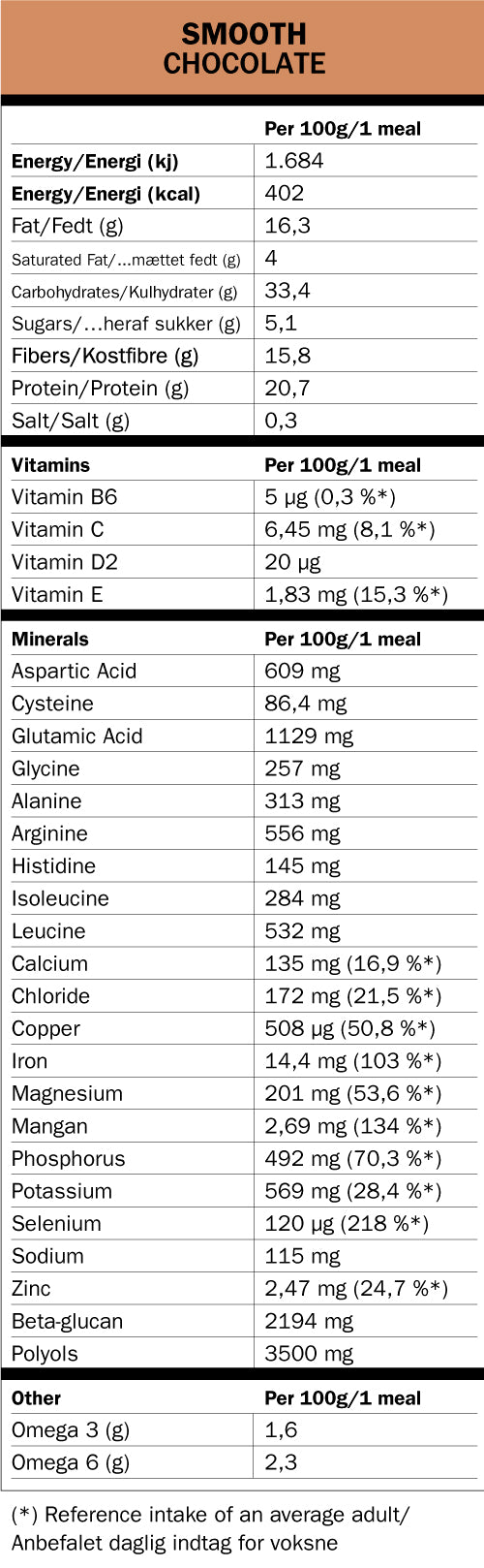 EatSmart365 Smooth Chocolate er den ultimative løsning, når du vil have et næringsrigt måltid på farten. Bland vand og pulveret og ryst shakeren – så har du et komplet, sundt, mættende og velsmagende måltid på under et minut.